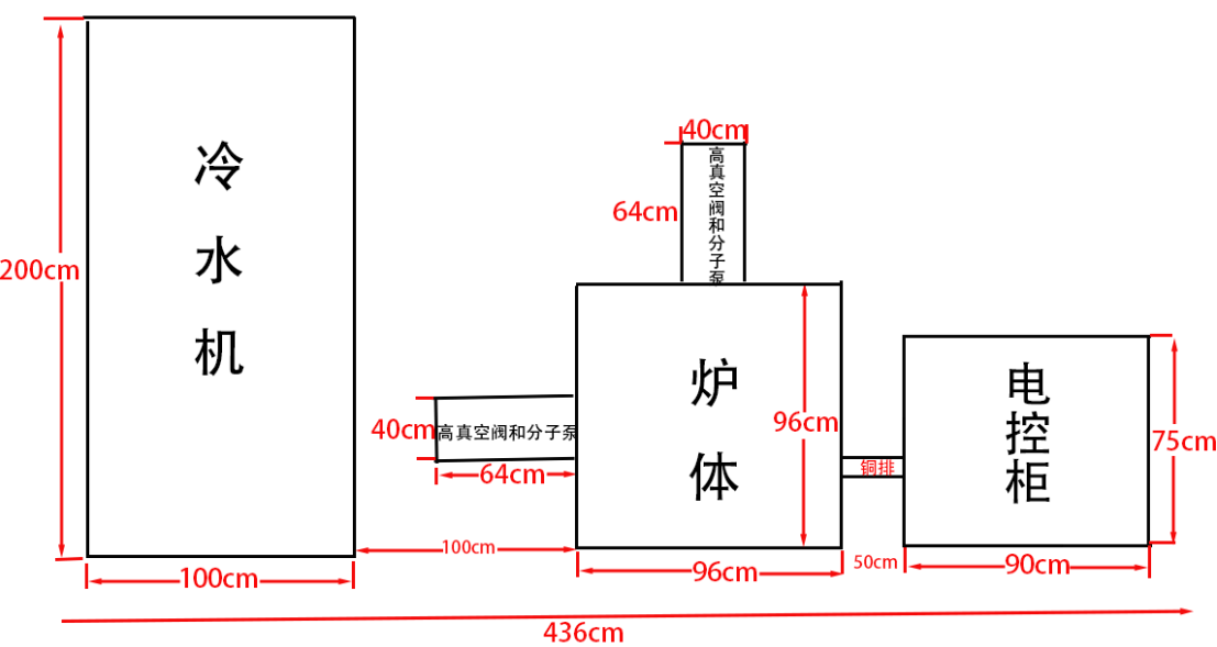 炉子用电三相380V,功率50KW, 空开120A 电缆线25平方 冷水机三相380V,功率20.7KW,空开50A ,电缆线10平方 水冷机最好用去离子水或矿泉水,水冷机前后左右空出80cm距离 炉子重760Kg 电控柜560Kg 分布图 |